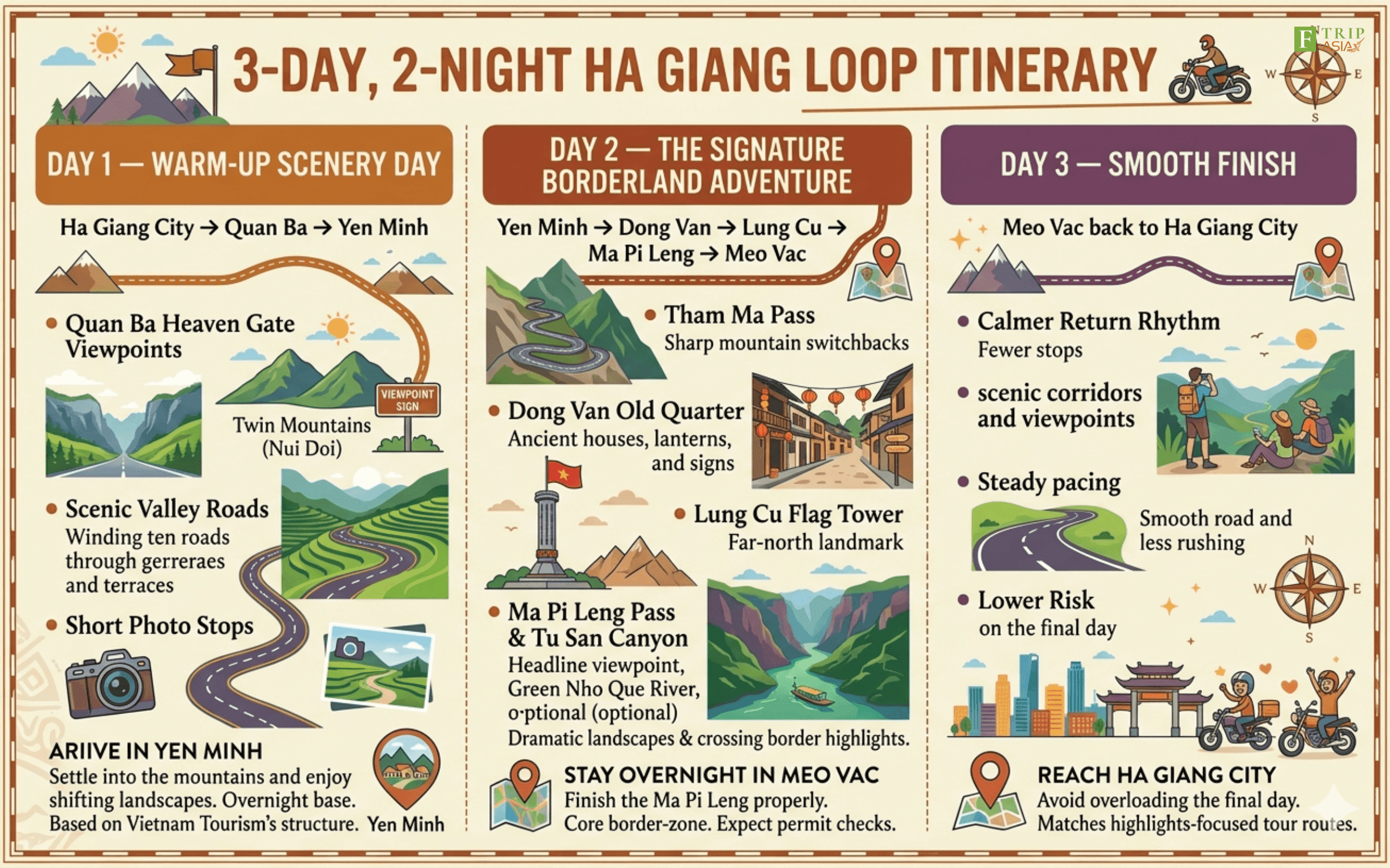 A classic 3 days 2 nights Ha Giang Loop usually follows this shape: Day 1 Ha Giang City to Quan Ba to Yen Minh, Day 2 Yen Minh to Dong Van to Lung Cu to Ma Pi Leng to Meo Vac, Day 3 Meo Vac back toward Ha Giang City. That route is popular because it covers the Loop’s signature landscapes without forcing every stop into a sprint. One practical point matters for foreign travelers: several current Ha Giang permit guides say major parts of this route sit in regulated border areas, and foreigners may need a border travel permit and may encounter checkpoints.