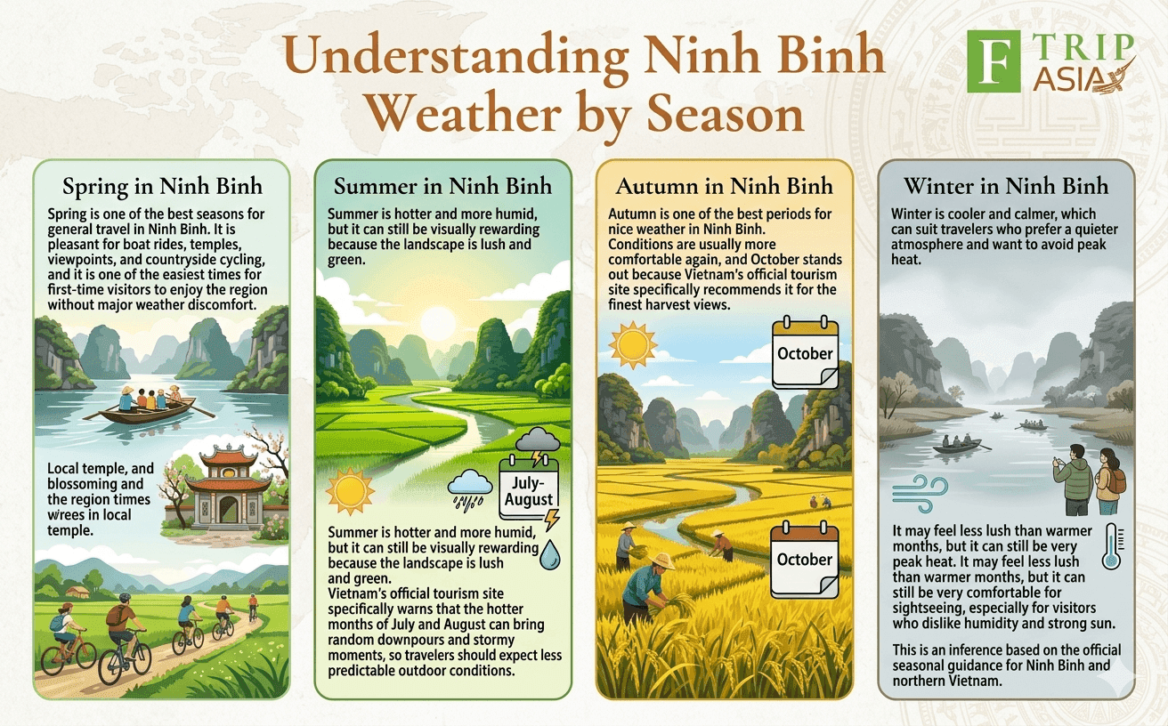 There is still no one perfect month for everyone. Some travelers care most about cool weather, others want golden rice fields, fewer crowds, or greener scenery. The best month depends on whether your priority is comfort, photography, seasonal beauty, or how Ninh Binh fits into a wider Vietnam itinerary. This is partly an inference based on the official weather guidance and the seasonal differences described for Ninh Binh and northern Vietnam.
