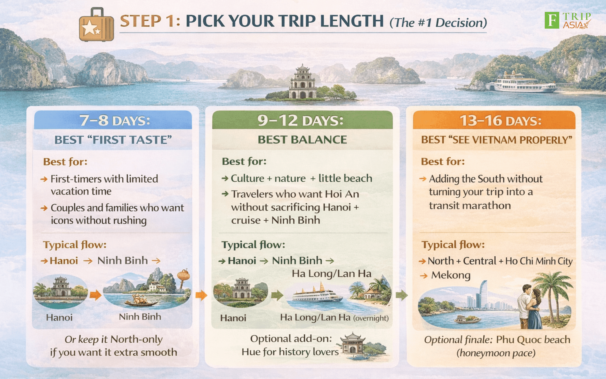 Most first-timers love 10–12 days North + Central (Hanoi + Ninh Binh + Ha Long/Lan Ha + Hoi An/Da Nang) because it hits Vietnam’s icons without rushing.