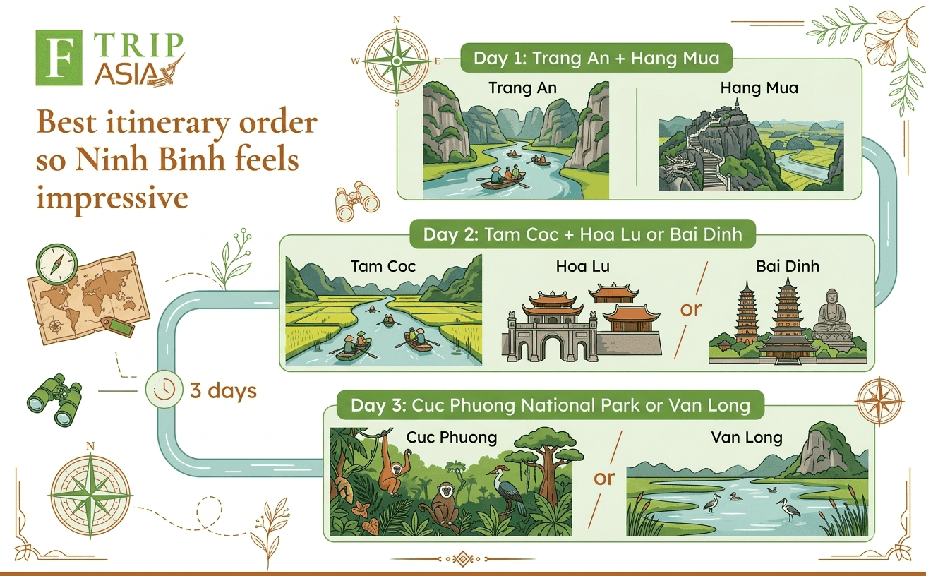 For most first-time visitors, the smartest way to experience Ninh Binh is to build around three anchors: one core boat-and-karst experience, one viewpoint, and one culture or nature add-on. The strongest first-timer combination is usually Trang An + Hang Mua + Hoa Lu or Bai Dinh, then Tam Coc, Cuc Phuong, or Phat Diem Cathedral if you have more time.