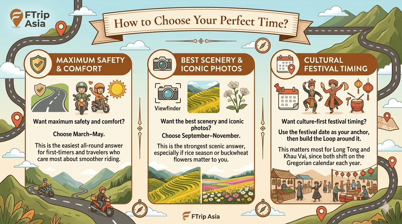 To add culture, plan around Long Tong or Khau Vai and confirm the lunar-calendar dates before you book. If your goal is the most iconic visual version of Ha Giang, October–November is usually the sweet spot.