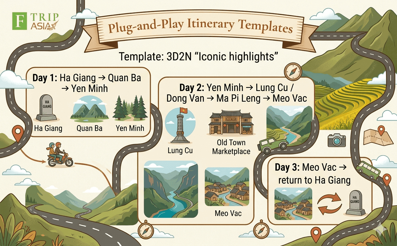 If you want the Ha Giang Loop to feel like the full experience, plan 4D3N as your baseline. That is the point where the trip usually stops feeling like a rushed checklist and starts feeling like a proper mountain journey. It matches the classic route logic, protects the Dong Van–Meo Vac / Ma Pi Leng highlight day, and gives you enough room for scenery, culture, and better decisions on the road.