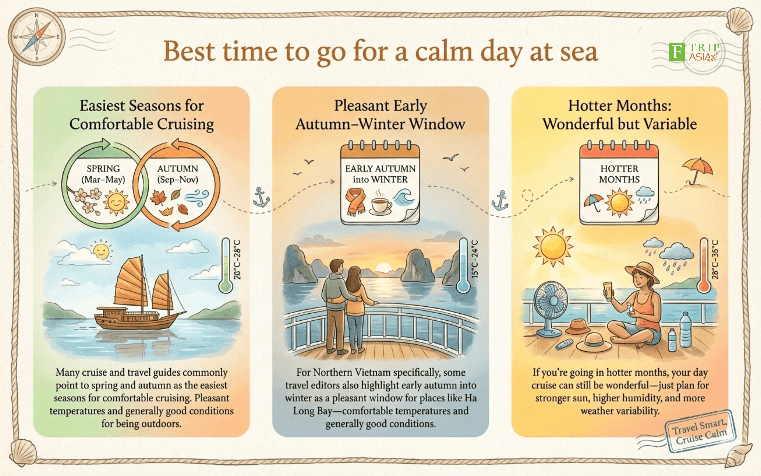 For comfortable cruising conditions, many guides commonly recommend spring and autumn windows (often framed as March–May and September–November), and some travel editors also highlight Northern Vietnam (including Ha Long Bay) as especially pleasant in early autumn into winter.