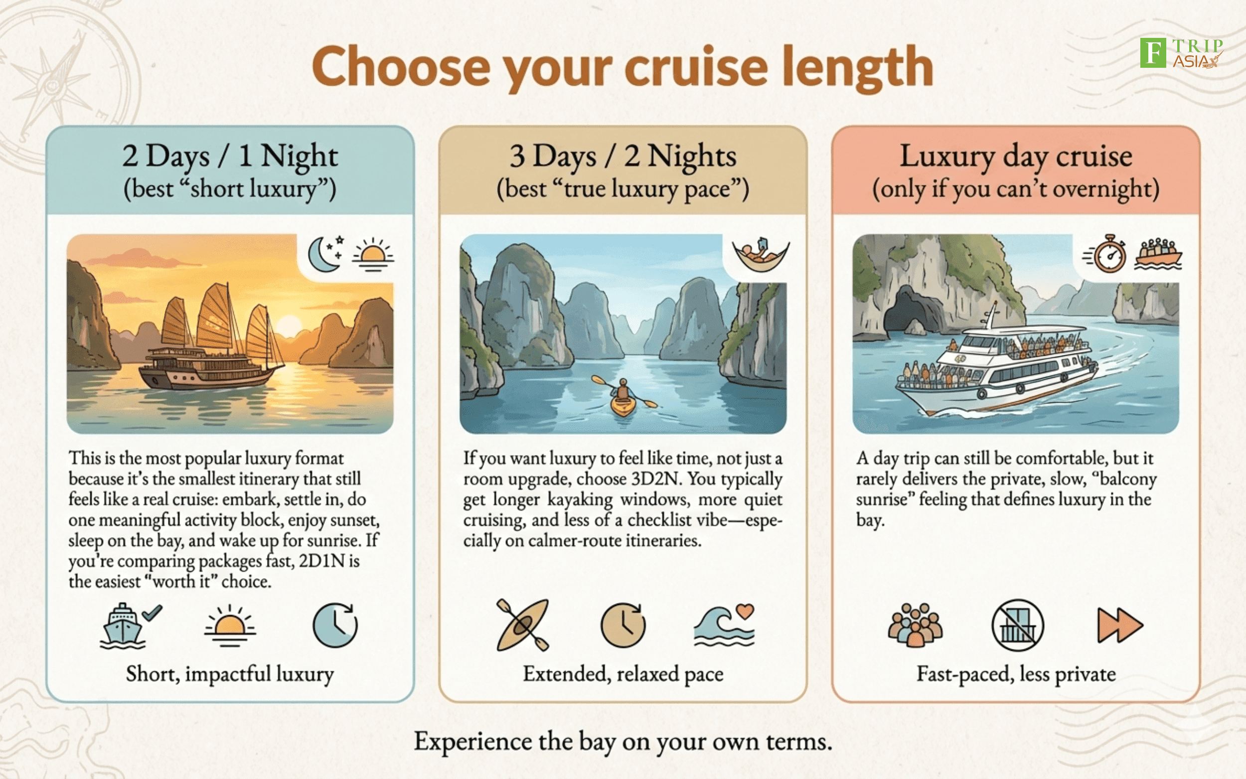 If your definition of luxury is “quiet deck space and calm water,” prioritize Lan Ha/Cat Ba-style itineraries when available.