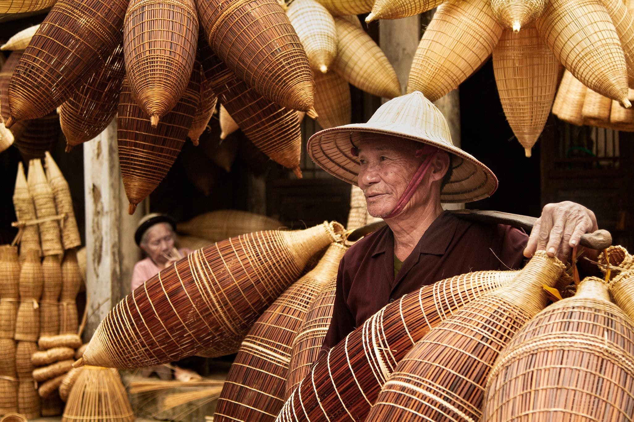 Đó is a Vietnamese bamboo tool made for fishing; thin slats of old bamboo are sharpened and woven together to create a basket. Fish follow the current, swim into the basket, and cannot get back out. For two centuries, the people of Thu Sy village, Hung Yen province have been weaving đó. Today, about 500 crafters are hard at work to produce these tools for fishers and home decorators. Most of them have been doing this for their whole lives. They sell two types of đó, plain white or smoked to create an attractive reddish-brown hue.