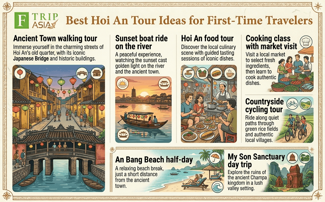 The clearest takeaway is this: the best Hoi An tour ideas for first-time travelers usually combine one heritage experience, one local food or cooking experience, and one scenic add-on such as a boat ride, countryside ride, or beach stop.