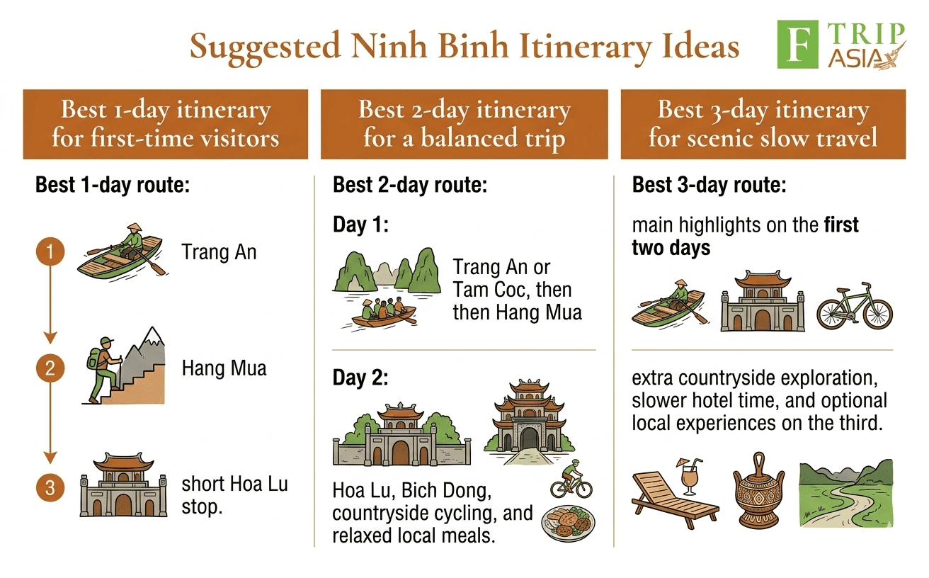 For most people, 2 days in Ninh Binh is the best answer. It gives enough time to see the major sights without rushing, and it allows you to combine natural scenery with cultural attractions. That usually matches what first-time visitors actually want from Ninh Binh. Official tourism guidance supports this by showing that the area has multiple major experiences, not just one headline stop.