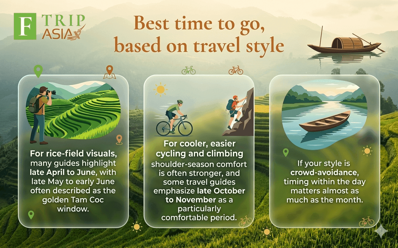 For rice-field visuals, many guides highlight late April to June, with late May to early June often described as the golden Tam Coc window.
