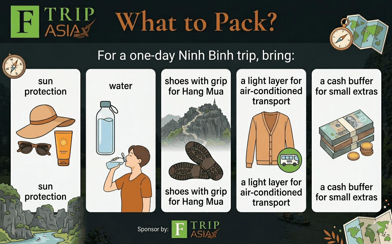 For a one-day Ninh Binh trip, bring: