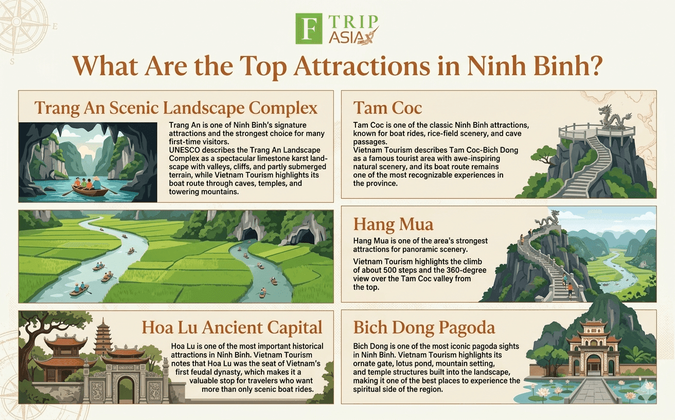 For photographers, the best attractions are Hang Mua, Tam Coc, Trang An, and Bich Dong because they combine panoramic views, waterways, seasonal fields, and temple architecture. This is an inference based on the visual qualities emphasized in the official attraction descriptions.