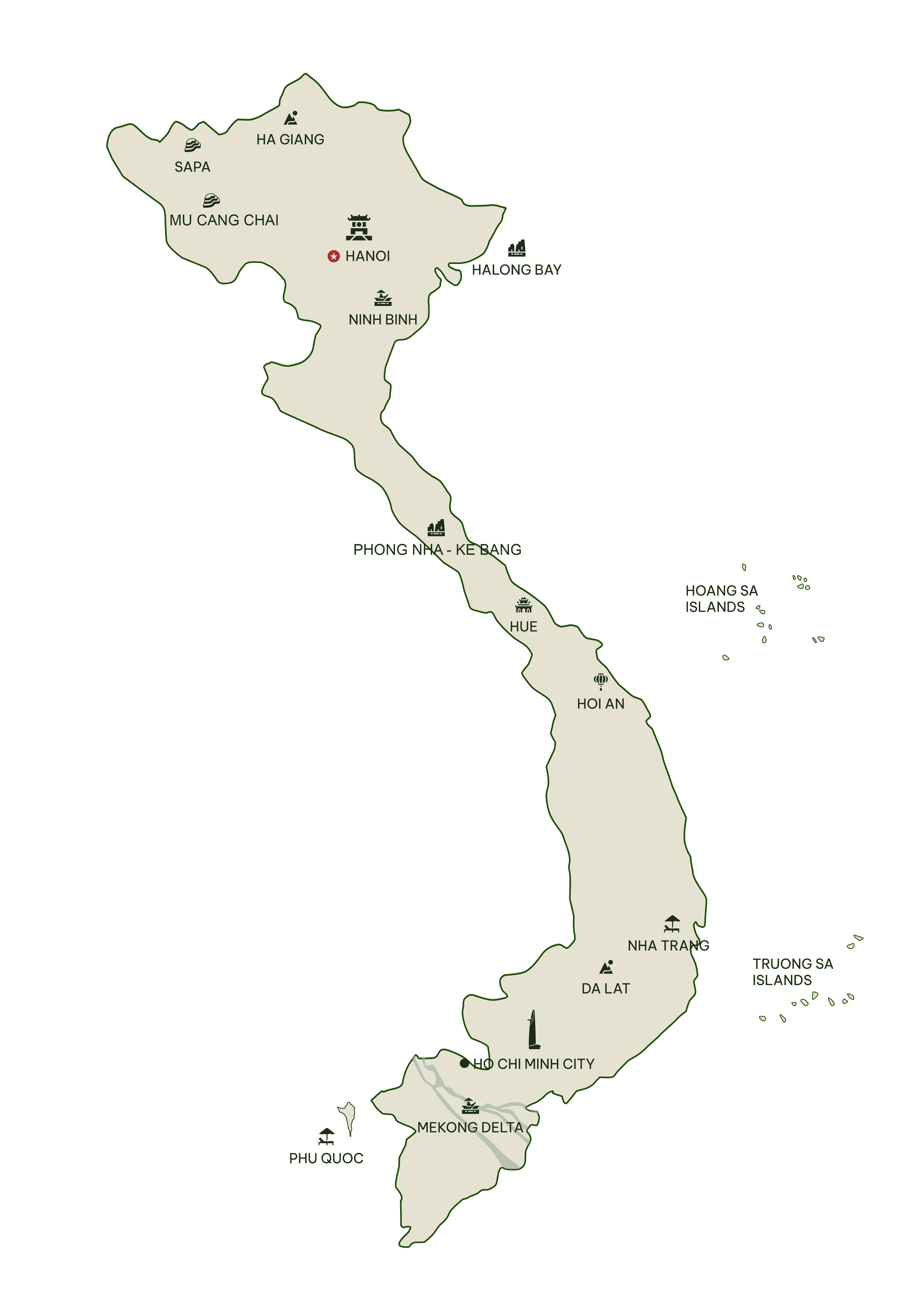 Embark on an unforgettable 14-day journey across Vietnam’s most compelling landscapes and must-see highlights. From the energetic streets of Ho Chi Minh City to the peaceful waterways of the Mekong Delta and Can Tho, you'll experience Vietnam’s deep cultural traditions. Travel onward through the scenic coastal and highland gems of Phan Thiet, Phan Rang, Da Lat, Hoi An, and Da Nang. Feel the historic charm of Hanoi, then venture to the dramatic terraced fields of Long Coc, Nghia Lo, and Mu Cang Chai. Conclude the tour spellbound by the ethereal limestone karsts of Ha Long Bay. Discover the heart and soul of Vietnam on this remarkable expedition.