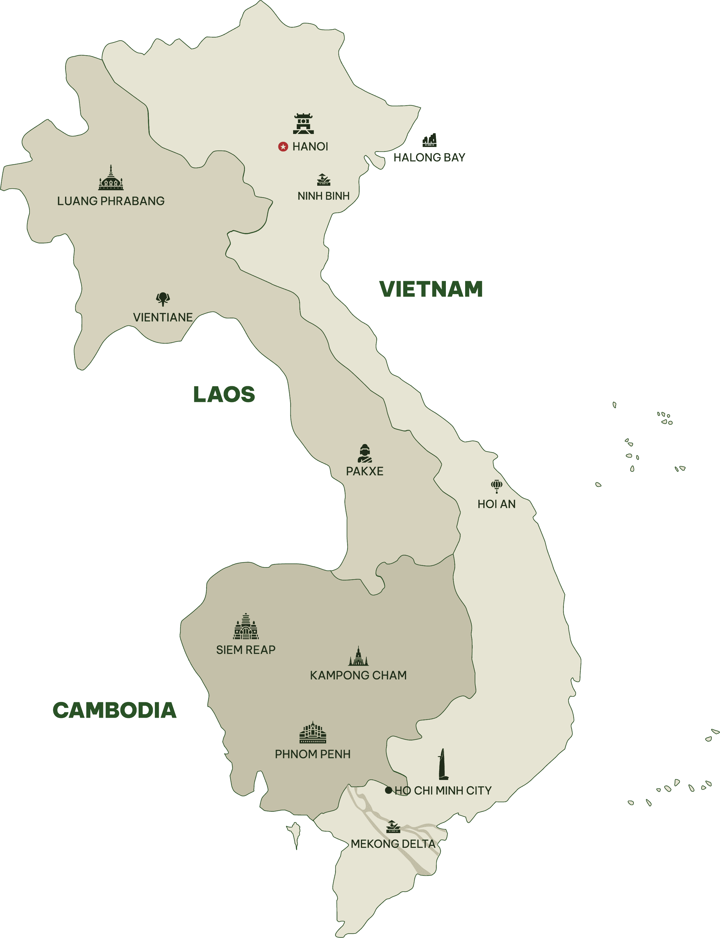 Routing: Ha Noi - Ninh Binh - Ha Noi - Ha Long - Hoi An - Ho Chi Minh - Can Tho - Chau Doc - Phnom Penh - Siem Reap - Kampong Cham - Pakse - Luang Prabang - Vientiane - Luang Prabang - Ha Noi