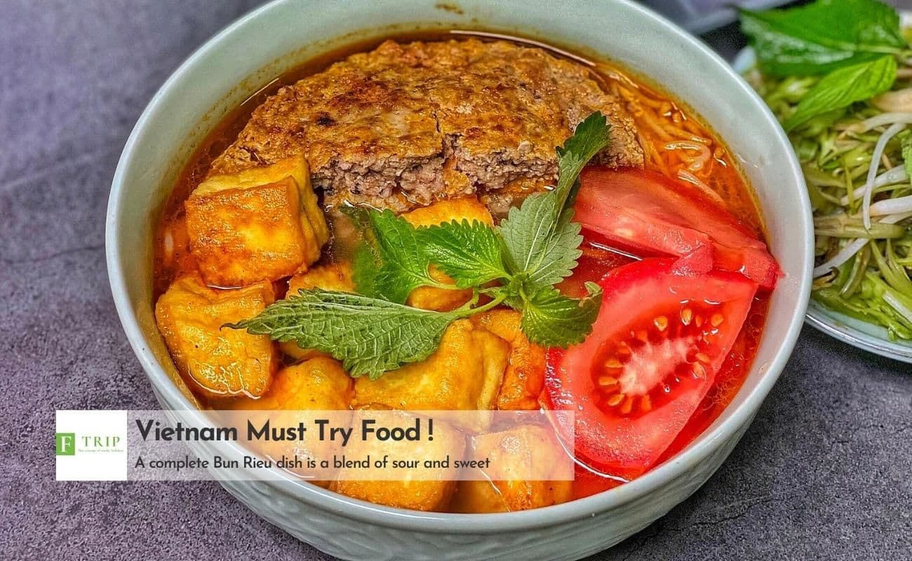 Lastly, we can have a bowl of Bun Rieu for lunch. This hearty Hanoi specialty is packed with ingredients made primarily with fresh rice vermicelli and crab paste. The broth is light yet flavorful, featuring a tangy taste from tomatoes and fermented rice vinegar. The dish is topped with golden crab clusters, minced crab meat, and often enhanced with shrimp paste, fried shallots, and a variety of fresh herbs and vegetables.