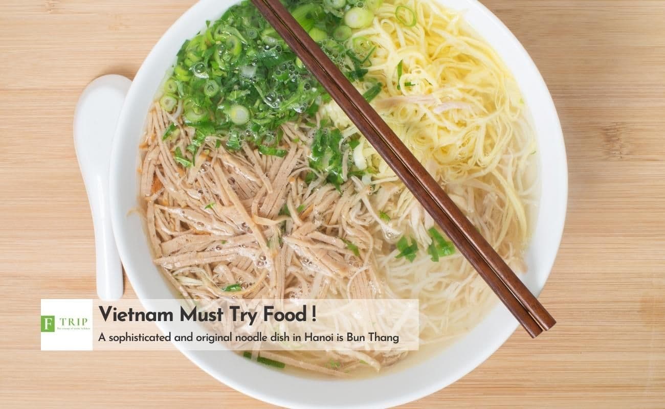 We will have breakfast with Bun thang, which has an elegant presentation. It is often compared to a “five-colored flower” (bông hoa ngũ sắc), a true symbol of the capital’s culinary refinement. This dish is a delicate harmony of flavors, made with ingredients such as dried shrimp, shredded chicken, fried egg, and Vietnamese pork sausage.