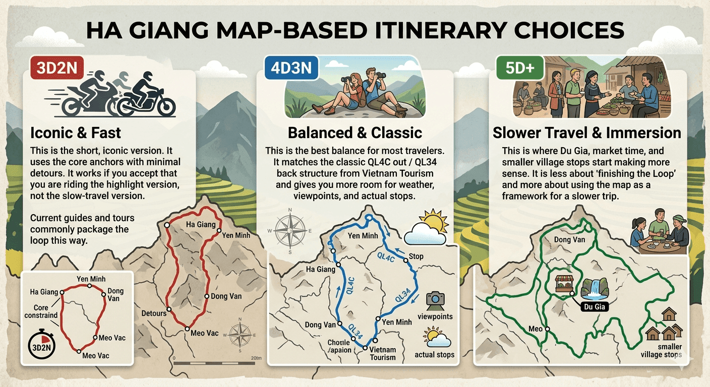 The Ha Giang Loop looks simple on a map until you realize the “loop” is really a chain of mountain segments, not one continuous easy road. Most travelers start and end in Ha Giang City, then move through Quan Ba, Yen Minh, Dong Van, and Meo Vac, with some itineraries adding Du Gia on the return. Vietnam Tourism’s official four-day route describes the classic structure as following QL4C northeast from Ha Giang and then QL34 southwest back toward Ha Giang, which is the cleanest way to understand the route before you ride.
