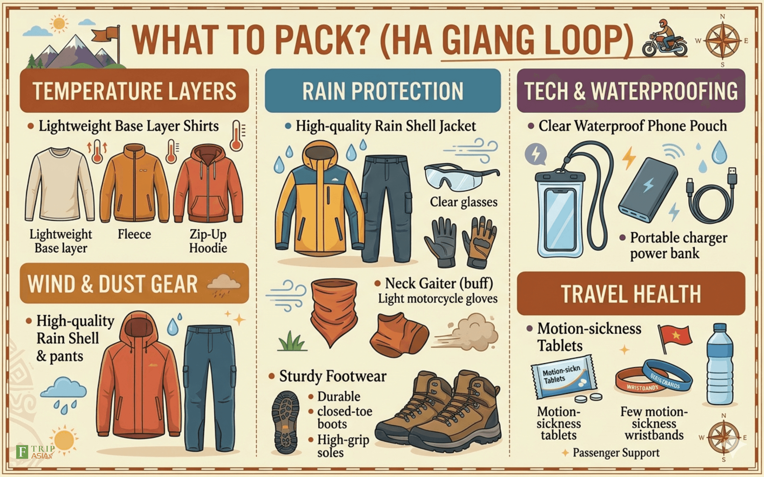 Those are practical essentials for long mountain-road days and shifting weather. This is an inference from route conditions and current season guidance.