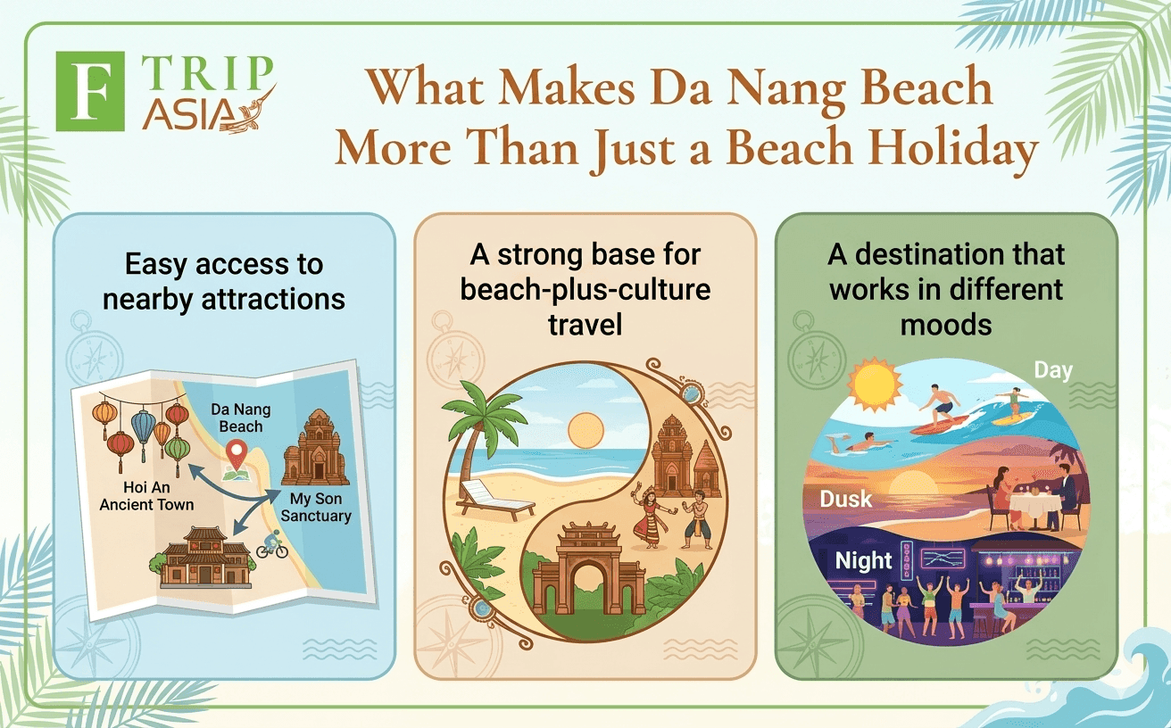 Da Nang supports a wider Central Vietnam route very well. Travelers can use the beach as a relaxing anchor, then add cultural visits, food stops, or countryside extensions without giving up convenience. This is one of the reasons FtripAsia is especially useful here: FtripAsia can turn a beach booking into a more complete Da Nang–Hoi An–Marble Mountains journey instead of a one-dimensional stay.